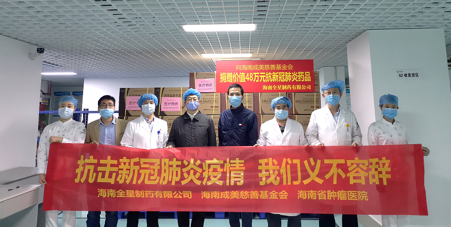 在全省上下疫情防控關鍵時期,海南全星制藥有限公司始終不忘履行社會責任,繼2月5日向??谑屑t十字會捐贈107萬元的抗疫藥品后,全星再行動,2月7日,向海南成美慈善基金會捐贈價值48萬元的抗疫藥品,用于支持海南省腫瘤??漆t療聯合體下轄110多家醫療機構開展一線疫情防控工作,助力我省早日打贏疫情防控攻堅戰。