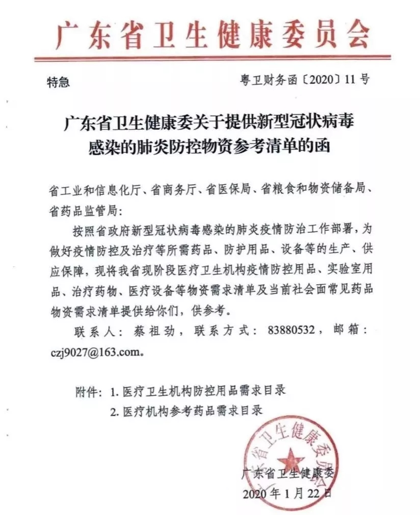 ▲廣東省衛生健康委員會《關于提供新型冠狀病毒感染的肺炎防控物資參考清單函》
